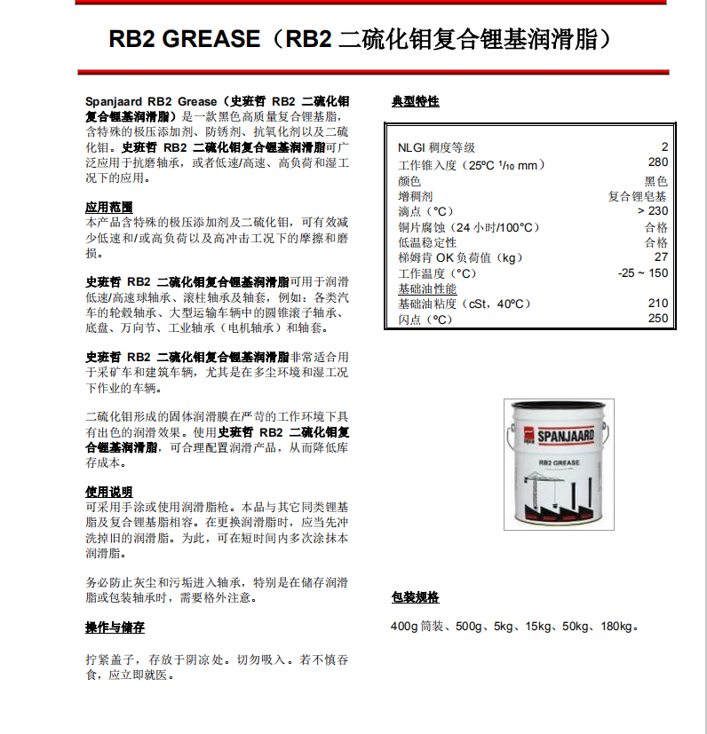 史班哲RB2耐高溫二硫化鉬復(fù)合鋰基潤滑油脂輪轂軸承軸套潤滑油劑